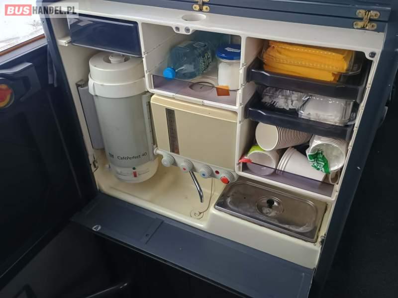 : lodówka, caffebar, fotele odchylane, oświetlenie indywidualne, nawiewy dyszowe, siateczki, ABS, ASR, tempomat, retarder, podnóżki, stoliczki, mikrofon, klimatyzacja, radio, regulacja wysokości nadwozia, centralny zamek, podwójne szyby boczne, wspomaganie kierownicy, elektryczne lusterka, fotele odchylane i rozsuwane, ogrzewanie stacjonarne