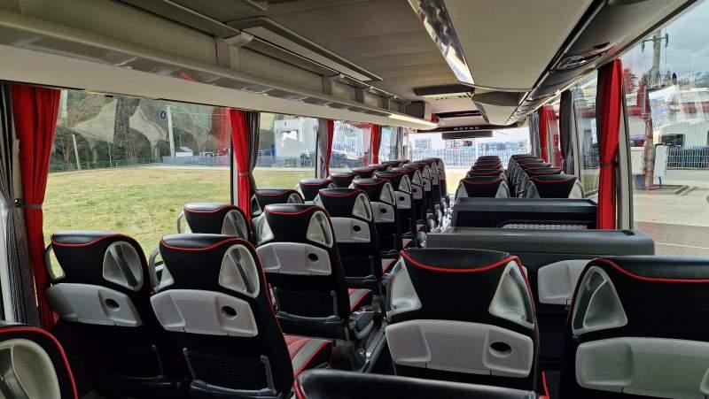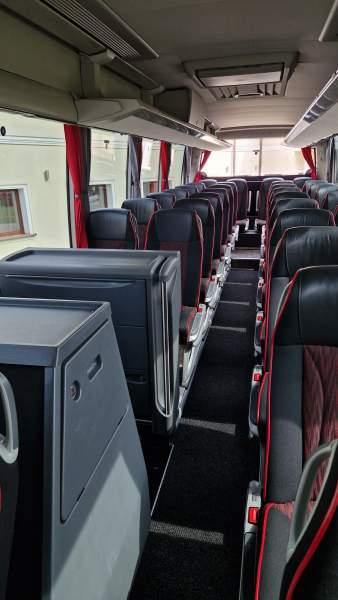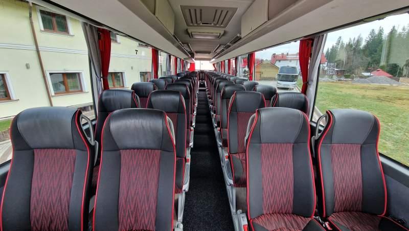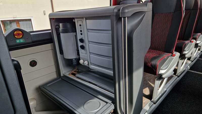 : video, WC, lodówka, caffebar, kabina sypialna, fotele odchylane, oświetlenie indywidualne, nawiewy dyszowe, siateczki, ABS, ASR, tempomat, retarder, telefon, nawigacja, CD, podnóżki, stoliczki, mikrofon, klimatyzacja, radio, regulacja wysokości nadwozia, centralny zamek, podwójne szyby boczne, wspomaganie kierownicy, elektryczne lusterka, fotele odchylane i rozsuwane, DVD, ogrzewanie stacjonarne, hak holowniczy, ESP