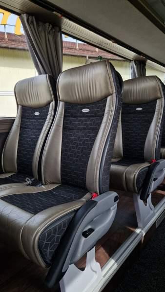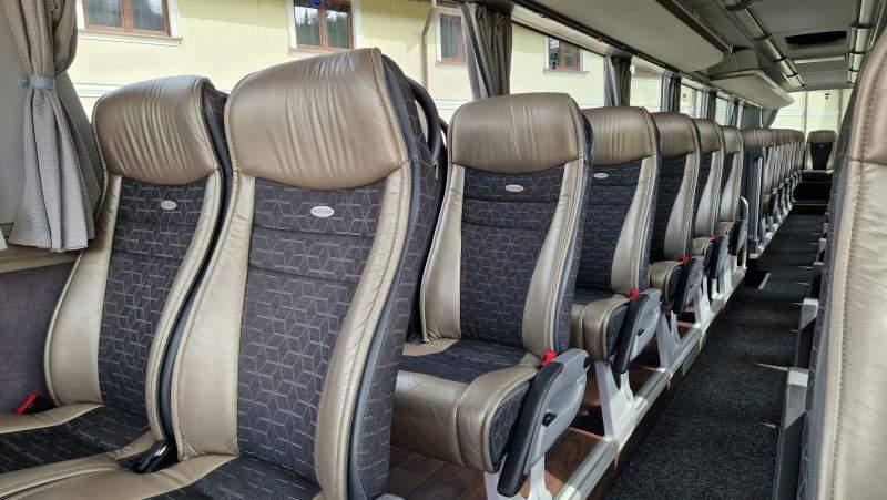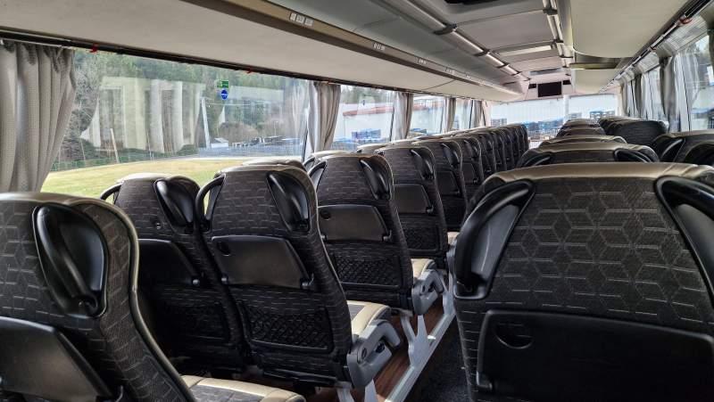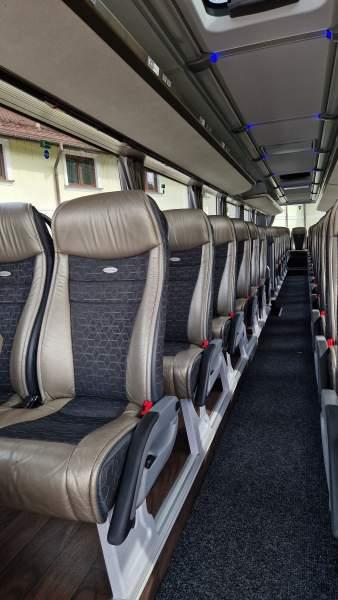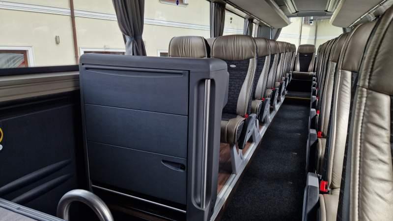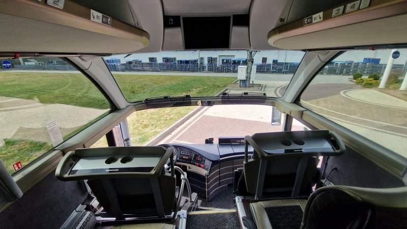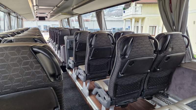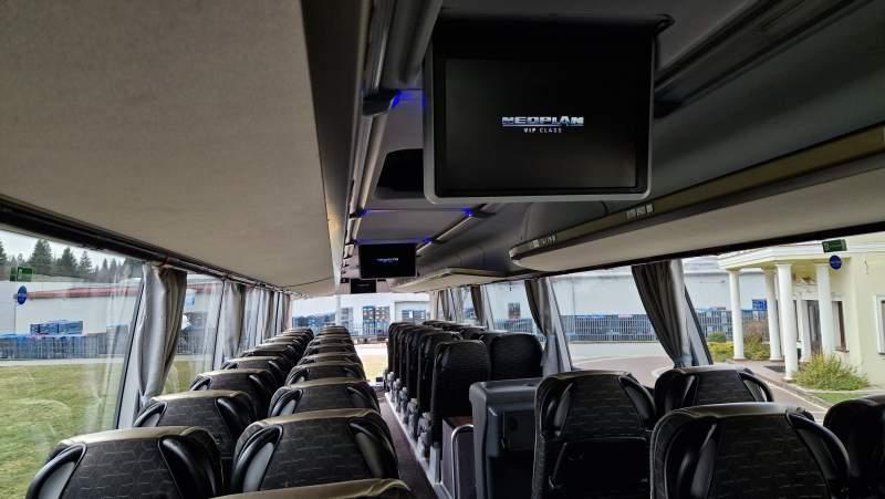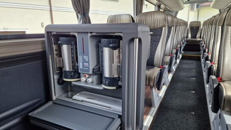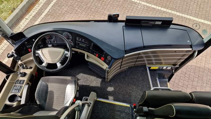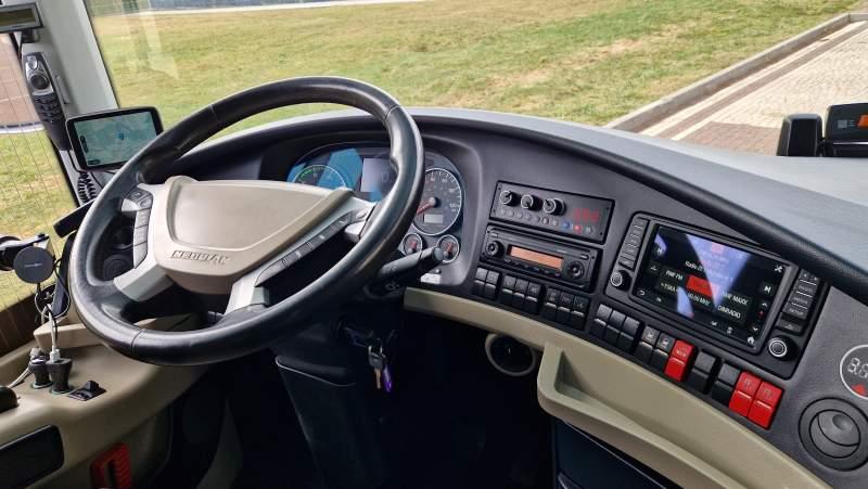 : video, WC, lodówka, caffebar, kabina sypialna, fotele odchylane, oświetlenie indywidualne, nawiewy dyszowe, siateczki, ABS, ASR, tempomat, retarder, telefon, nawigacja, CD, podnóżki, stoliczki, mikrofon, klimatyzacja, radio, regulacja wysokości nadwozia, centralny zamek, podwójne szyby boczne, wspomaganie kierownicy, elektryczne lusterka, fotele odchylane i rozsuwane, DVD, ogrzewanie stacjonarne, hak holowniczy, ESP