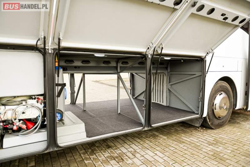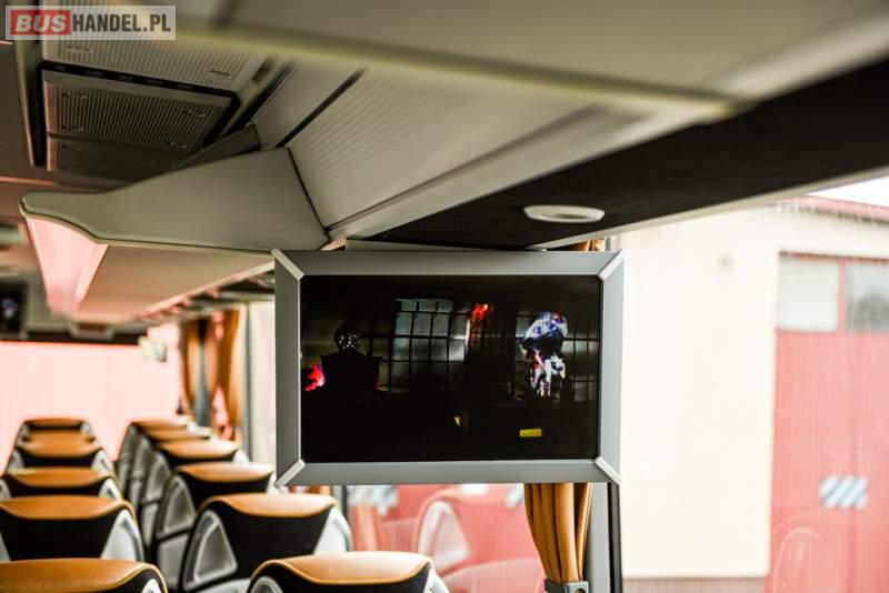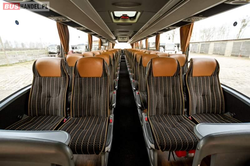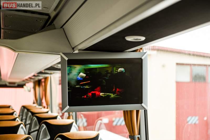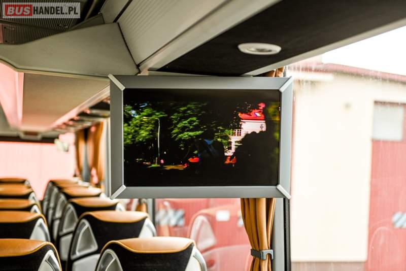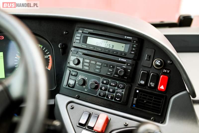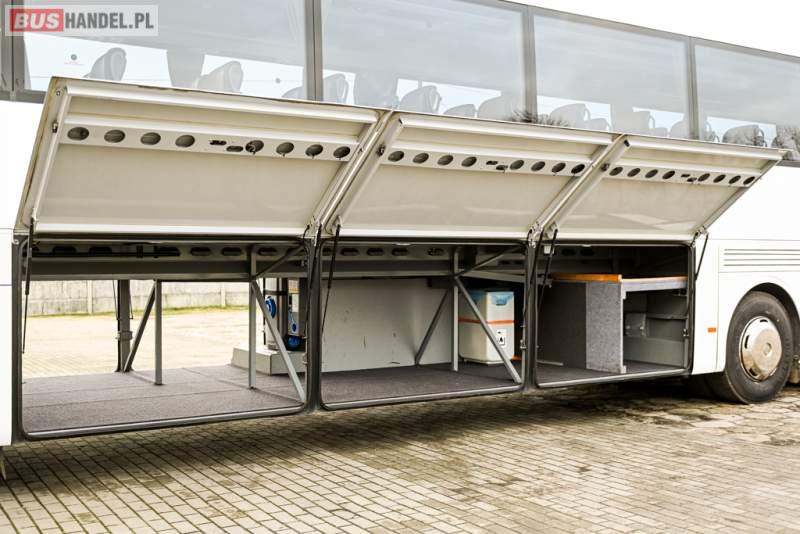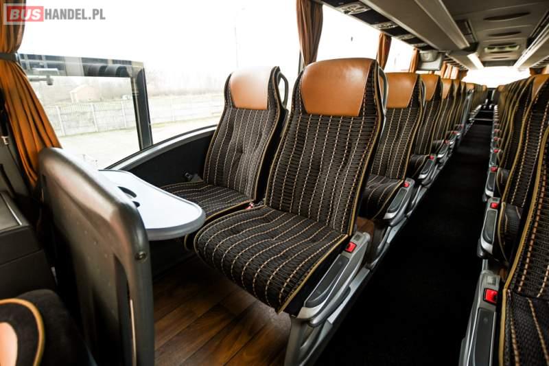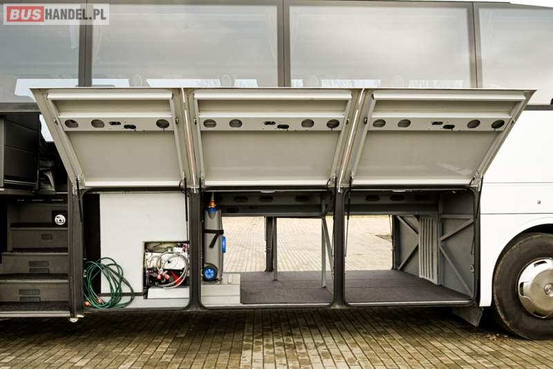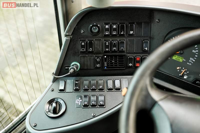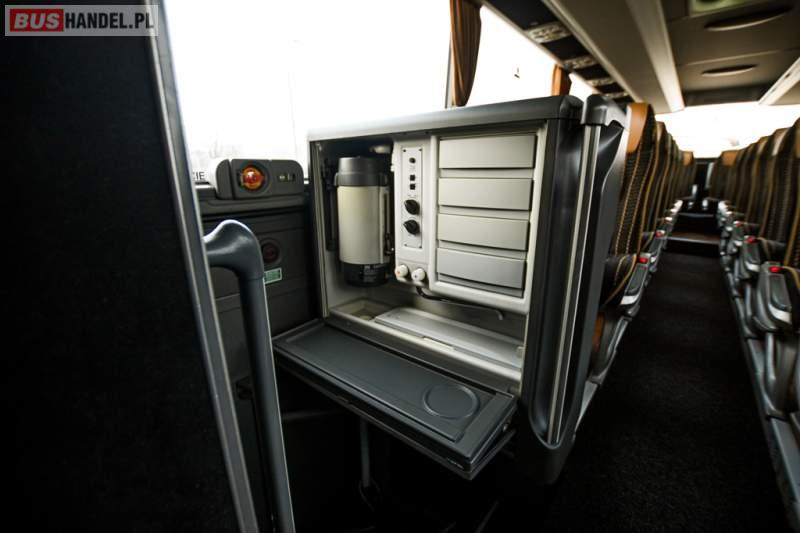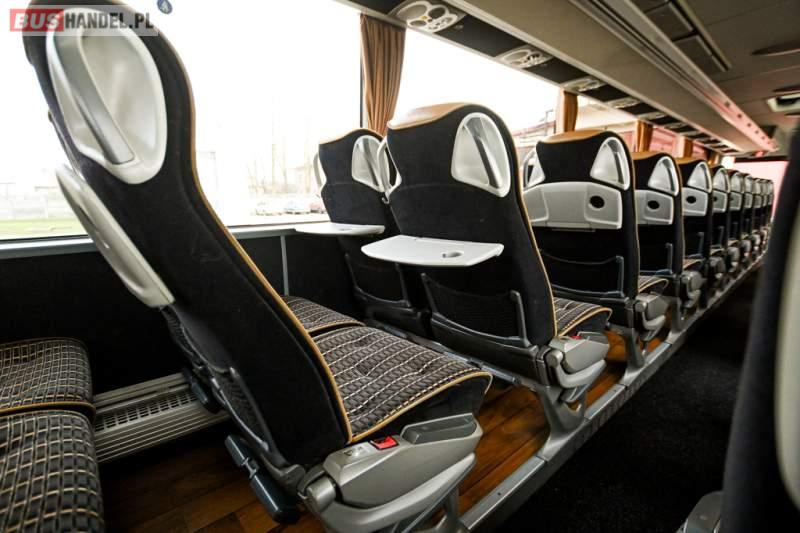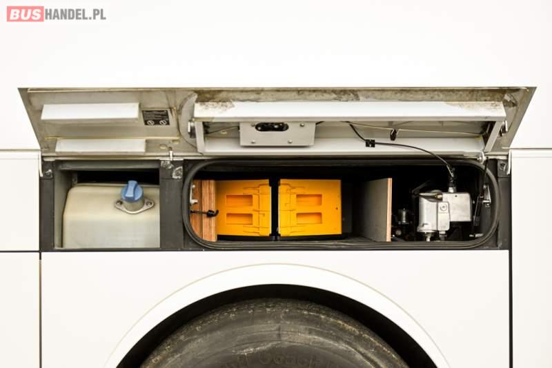 : klimatyzacja, WC, lodówka, caffebar, kabina sypialna, oświetlenie indywidualne, nawiewy dyszowe, podnóżki, stoliczki, siateczki, ABS, ASR, tempomat, retarder, telefon, nawigacja, CD, mikrofon, radio, fotele odchylane i rozsuwane, kuchenka mikrofalowa, wyświetlacz matrix, sejf, regulacja wysokości nadwozia, centralny zamek, podwójne szyby boczne, wspomaganie kierownicy, elektryczne lusterka, ogrzewanie stacjonarne, DVD, hak holowniczy, ESP