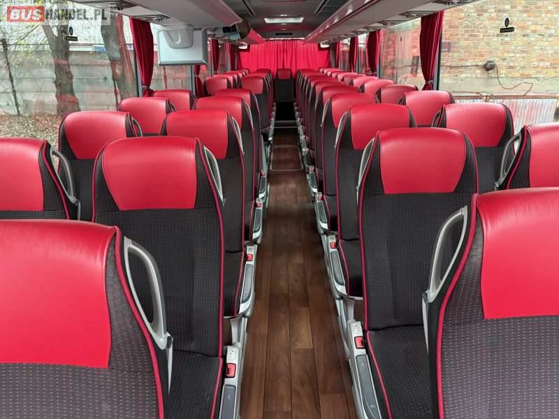 : video, WC, lodówka, caffebar, oświetlenie indywidualne, nawiewy dyszowe, siateczki, ABS, ASR, tempomat, retarder, CD, podnóżki, stoliczki, mikrofon, klimatyzacja, radio, regulacja wysokości nadwozia, centralny zamek, podwójne szyby boczne, wspomaganie kierownicy, elektryczne lusterka, aluminiowe felgi, fotele odchylane i rozsuwane, DVD, ogrzewanie stacjonarne, ESP